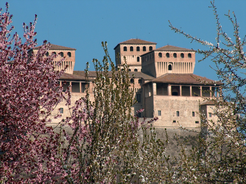 L'interno offre al visitatore un tripudio di sale affrescate, tra le quali la splendida Camera d'Oro considerata una delle più alte espressioni pittoriche del gotico internazionale in Italia: la stanza celebra il trionfo dell'amore dei due giovani signori, ma anche il prestigio della famiglia Rossi nel parmense, attraverso il viaggio immaginario di Bianca, "pellegrina" per amore, tra i vasti possedimenti e le terre del feudo. Il mirabile capolavoro, attribuito a Benedetto Bembo, documento iconografico prezioso per la precisa e minuziosa descrizione "al vero" dei castelli e del territorio, avvolge e coinvolge il visitatore in un susseguirsi dinamico quasi ‘cinematografico' di scene, dove la protagonista avanza con soave leggiadria tra le balze appenniniche, sotto un sole che trapunta di fiammeggianti raggi dorati il cielo patinato di cobalto. L'oro che ancora si coglie nel bagliore degli astri, nel fogliame e nei broccati degli abiti, rivestiva un tempo interamente le formelle di terracotta che ricamano la parte inferiore di tutte le pareti inondando di luce i visitatori della camera, che da ciò ha tratto il suo nome. Il ricordo di quella magia è adesso solo evocato nelle sobrie e "nude" formelle dove spiccano i due cuori di Bianca e Pier Maria avvinghiati in un abbraccio "digne et in eternum".