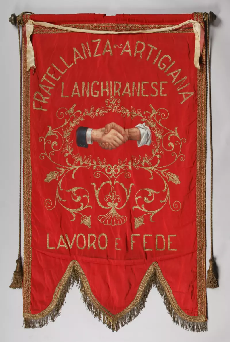 E' il labaro maggiore o gonfalone della "Fratellanza artigiana fra gli operai e i contadini del Comune di Langhirano" (più brevemente, Fratellanza Artigiana Langhiranese), una delle prime società di mutuo soccorso nate dopo l’unità nazionale. Fondata a Langhirano il 19 marzo 1869, si sciolse nel 1973. Tra i suoi promotori Faustino Tanara e Giuseppe Garibaldi come presidente onorario. Come risulta da documenti d’archivio, nel 1872 la Società, con appositi manifesti al pubblico, fece appello ai concittadini “onde fare acquisto di un Gonfalone” e la sottoscrizione iniziò il 2 novembre in alcuni negozi del paese (Archivio di Stato di Parma, Fondo Gabinetto di Prefettura, b. 85). Della Società si conserva nel museo anche un labaro di dimensioni minori, più recente
