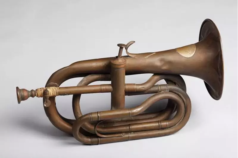 Tromba in ottone, con placchetta metallica identificativa ovale con incisione in corsivo “C.lo N.no F. Tanara Langhirano”