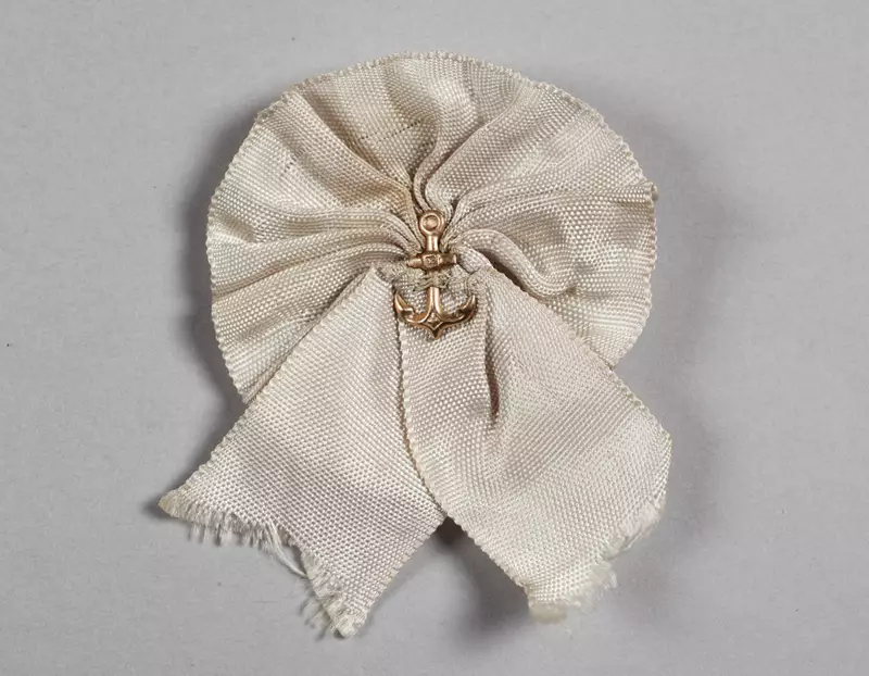 Coccarda realizzata con nastro bianco di seta cucito su un dischetto di tela, bottone centrale in metallo dorato a forma di piccola ancora