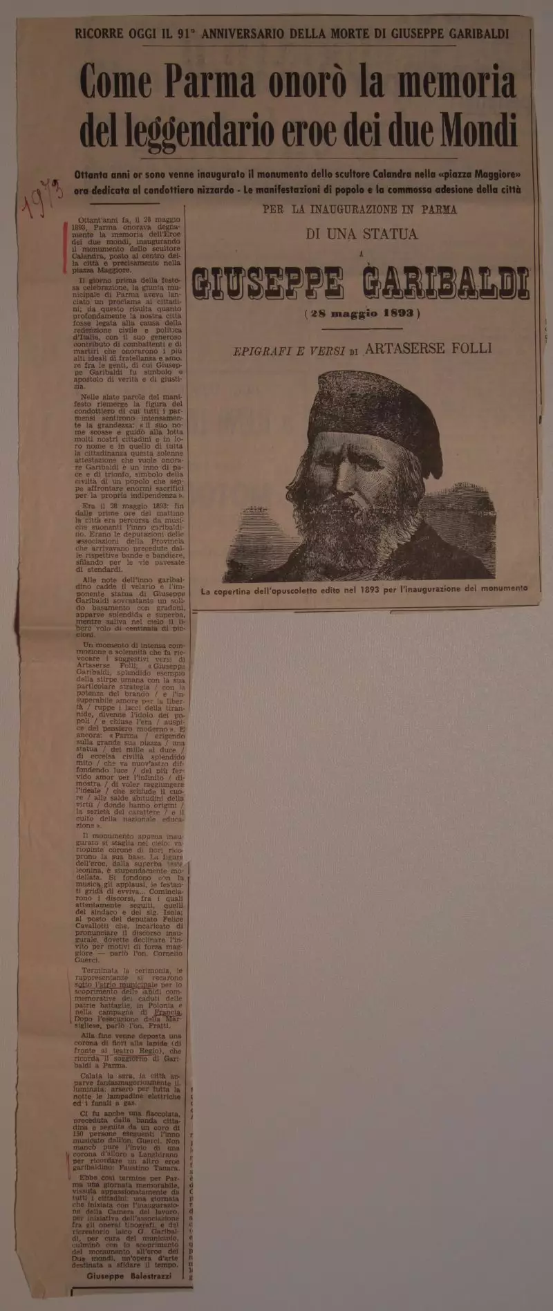 Ritaglio di giornale (Gazzetta di Parma?). Titolo: "Come Parma onorò la memoria del leggendario eroe dei due Mondi". Sopra il titolo: "Ricorre oggi il 91° anniversario della morte di Giuseppe Garibaldi". L'articolo è firmato da Giuseppe Balestrieri