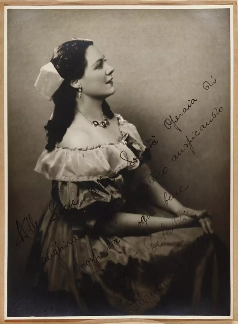 Figura intera di Renata Tebaldi, ritratta di lato, seduta